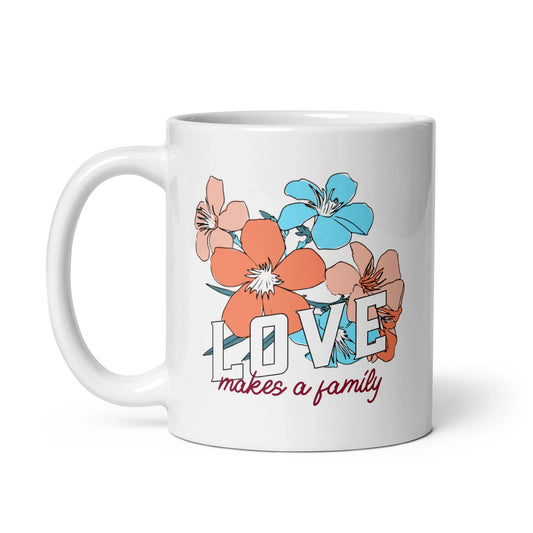 LOVE Makes a Family - beautiful floral design on a white glossy mug