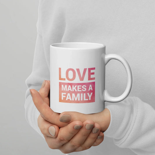 LOVE Makes A Family - pink background - White glossy mug